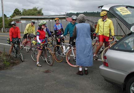 Above: Patty, our ever-ready sag hostess, urges us to eat some snacks at one of the mid-afternoon sag stops. The hatchback is full of goodies like cookies, juice, fruit, etc. Jim, temporarily the cameraman, is riding sag with Patty.