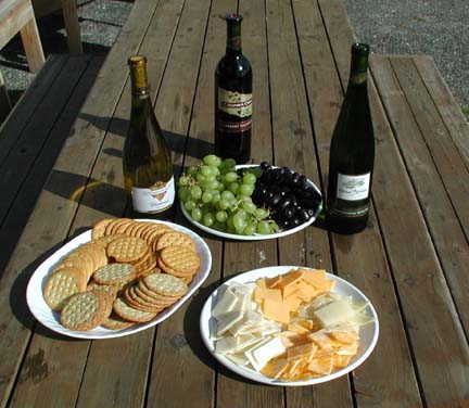 Above: In the picnic area on the terrace of the motel, Sandy sets out a wine-and-cheese happy hour for the group. Happy hour is a regular part of the day after everyone gets back and showered. There's beer and wine, but most bikers go for the sodas and juices. The nuts and chips are a big hit, too.