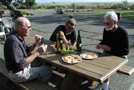 Above: Harold, Brian, and Jim are first at the cheese and grapes.