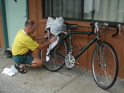 The day started with a stiff wind out of the south with predictions of occasional showers. It was the headwinds we were all gearing up for, not the possibility of showers. The showers came about 45 minutes into the day, but they were very light and few people did much to cover up. But they grew into a full-fledged warm rain that caught most of us unprepared. By lunch we were drenched!