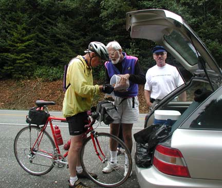 Above: Jim and Hans found us, and we went through the normal refueling routine. Here, Harold fills a plastic bag with Hans' home-made trail mix.