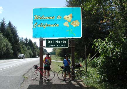 Above: Finally, we crossed the border to California. But first we had an outstanding lunch on our own at the marina in Brookings. We found a great fish-and-chips place and followed that with an ice cream from the local parlor. When the lady at the counter found out we were biking from Canada to Mexico, she gave us all super-sized scoops of ice cream...almost a pint for each of us! Wow, was that great!