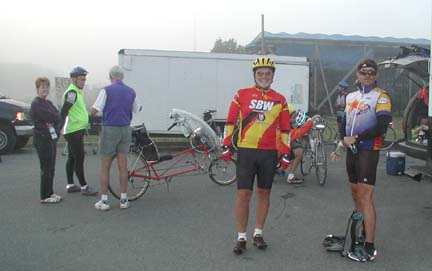 Above: John always wears his South Bay Wheelmen jersey at the beginning ride in each state. Standing next to John is Brian. Brian, usually in the lead, managed to bike this 73-mile hilly segment at an average of 16.9 mph. Behind John and Brian are Sandy, Allen, and Jim. Allen is the one riding the recumbent.