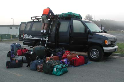 Above: We've got 23 people now and lots more luggage to get into the van each day. Here Hans climbs up to the top to adjust something.