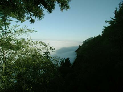Above: No picture can do justice to the next 30 miles. We biked through a continuous cathedral of giant redwoods along winding, two-lane roads. The bases of the redwoods were covered with ferns, the tops reached 300 feet and more. It was impossible to take pictures--too dark and too majestically tall. At one point after the seven-mile climb ended, we came out into this spectacular view. We were above the clouds! The mountain cast its own shadow on the clouds in the early morning light.