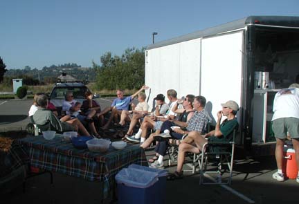 Above: At the end of the day, we gathered for Happy Hour. Sandy couldn't convince us to gather on the grass lawn near the motel. We all wanted to set up our chairs as close to the food and drinks as we could. After riding, bikers love lots of salty food and lots of liquid. But its the sharing of great stories that absorb our time. From left to right: John (Brian, Ken and Patty are behind him), Allen, Joan, George, Gail, Steve, Gary, Steve, Dave, and Leonard. Jim has his back to the camera, digging into the ice chest for another soda.