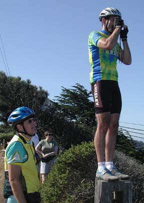 Above: Unfortunately, the marvelous view above was blocked by ugly power lines. Dave offered to hop up on the post and shoot the picture of Mendocino over the power lines. His roommate for this trip, Steve, looks on.