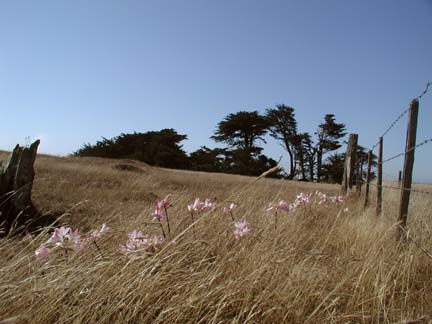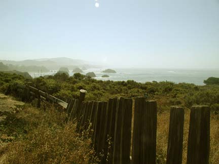 Above: This is typical of the majority of roads today. We cycled close to the coast, with rocky ocean headlands on one side and golden grasslands on the other. There were many cattle ranches, a few sheep farms, and one farmer who raised miniature horses. The wooden fence in this picture is found throughout Mendocino County.