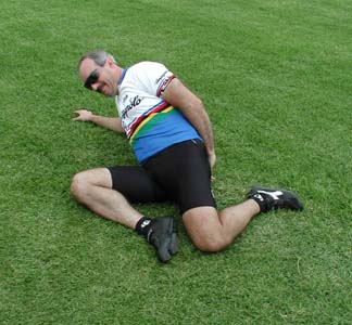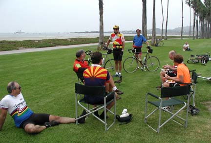 Above: We had to cycle 52 miles to our lunch stop on the oceanfront in Santa Barbara just south of the Sterns Wharf. Gary and Steve (standing with their bikes), who rode the Northern California segment of the ride last week, dropped by to visit with us during lunch. They live in Thousand Oaks and a trip to Santa Barbara and back is a frequent training ride for them. Seated at lunch are John, Mike, Barbara, and Harold. Bob is on the grass. Why? Well..